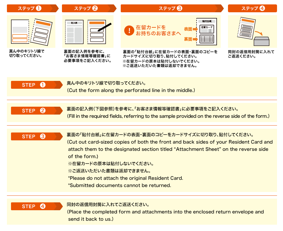 (The “Customer Information Confirmation Form” is a document used to request updated identification documents as part of our anti-money laundering and terrorist financing measures. This document is sent to customers who submitted their Residence Card when applying for their credit card, to periodically confirm their residency status, period of stay (expiration date), and other relevant information.)