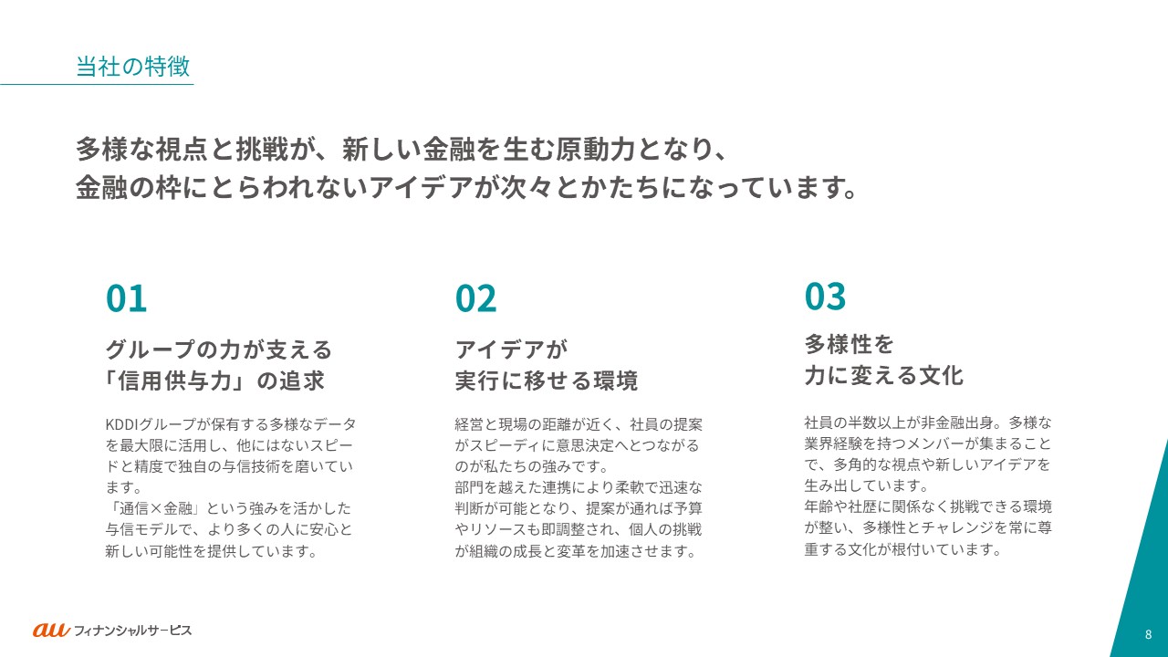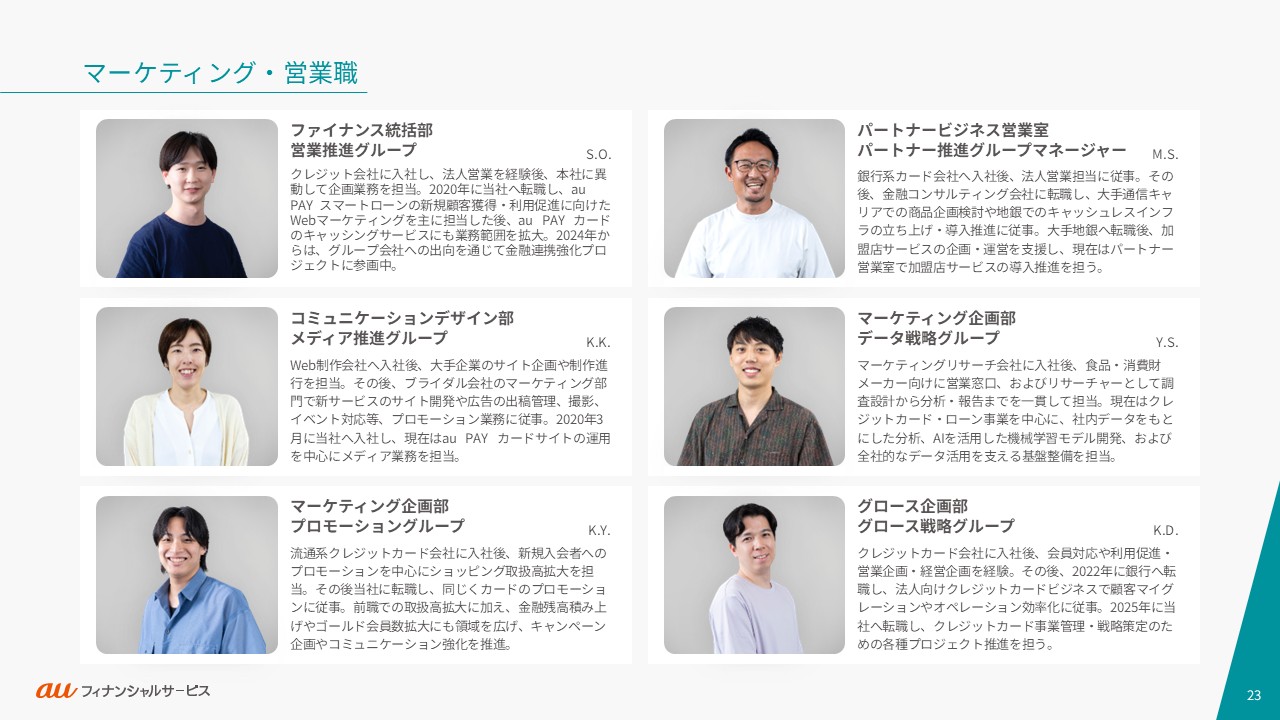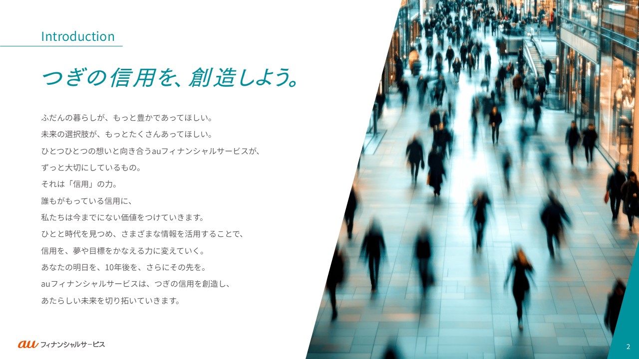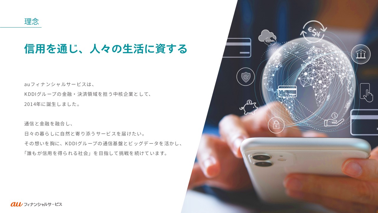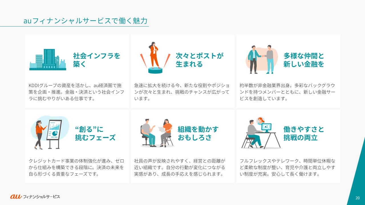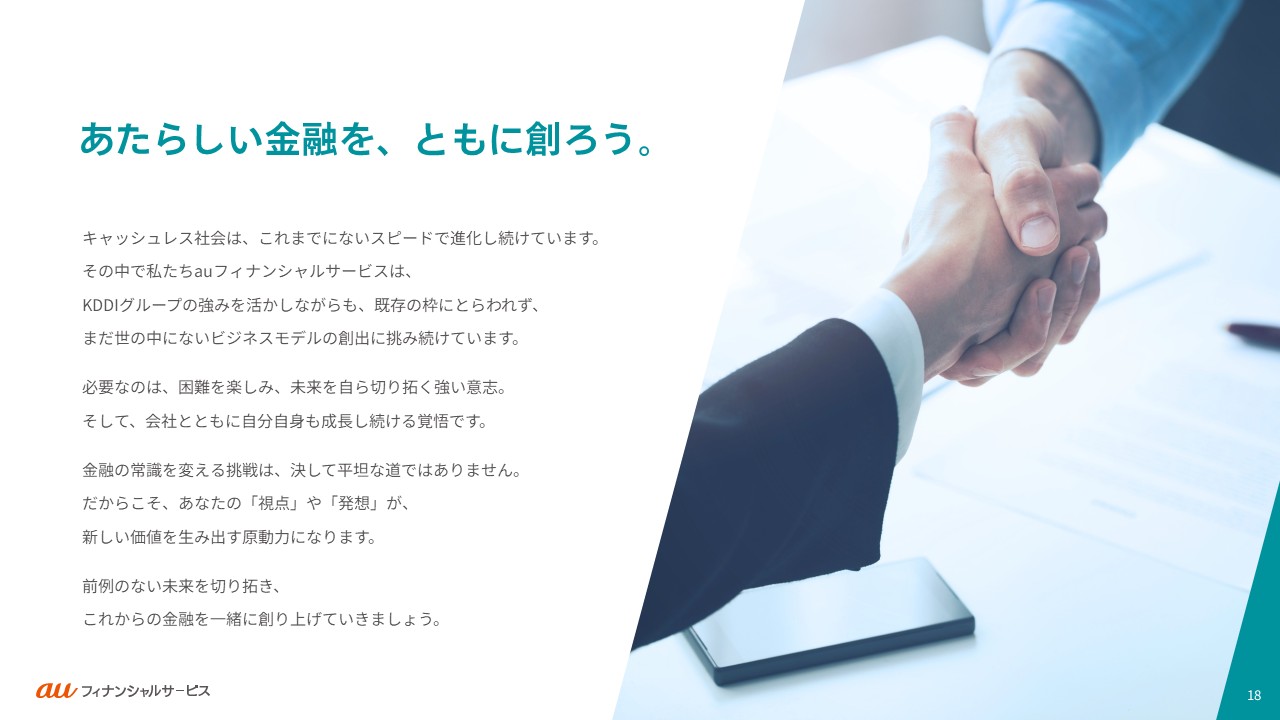 auフィナンシャルサービスの事業や働く人々・カルチャーをご紹介します。ご利用の端末やブラウザによっては、表示が崩れたり、正しく表示されない場合がありますので、PDFでもご覧ください。