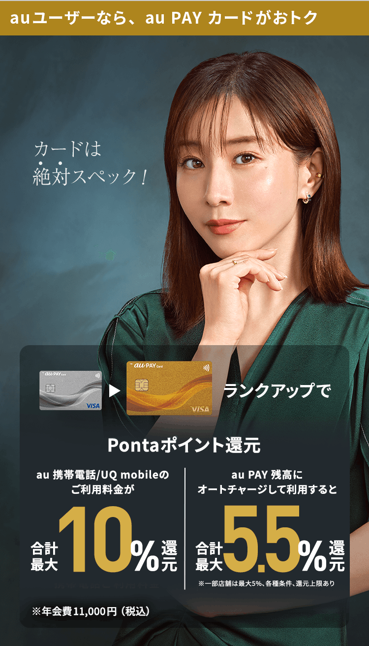 - ポイント計算、及び付与時点で、カード解約、カード種類変更等でau PAY ゴールドカード会員資格がない場合、またお支払いが遅延している場合は特典対象外となります。