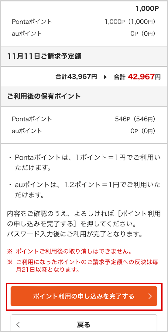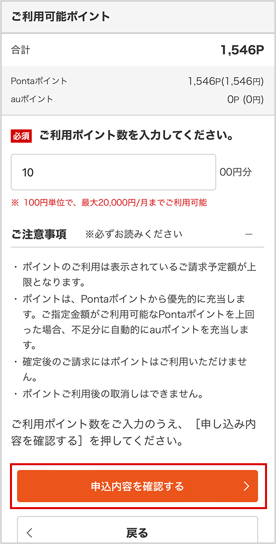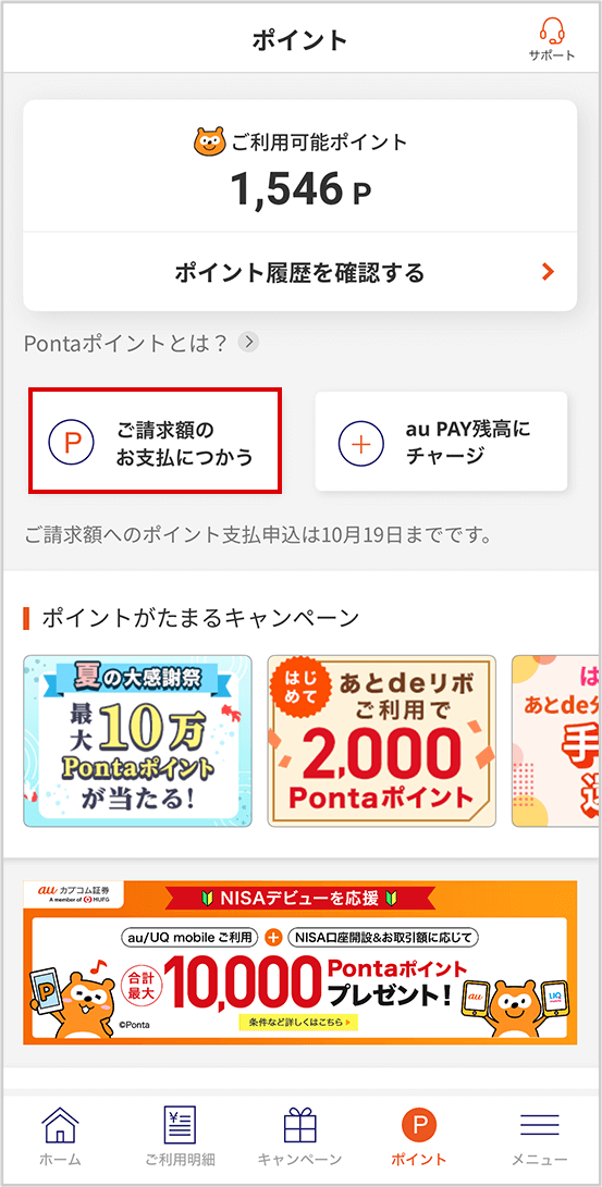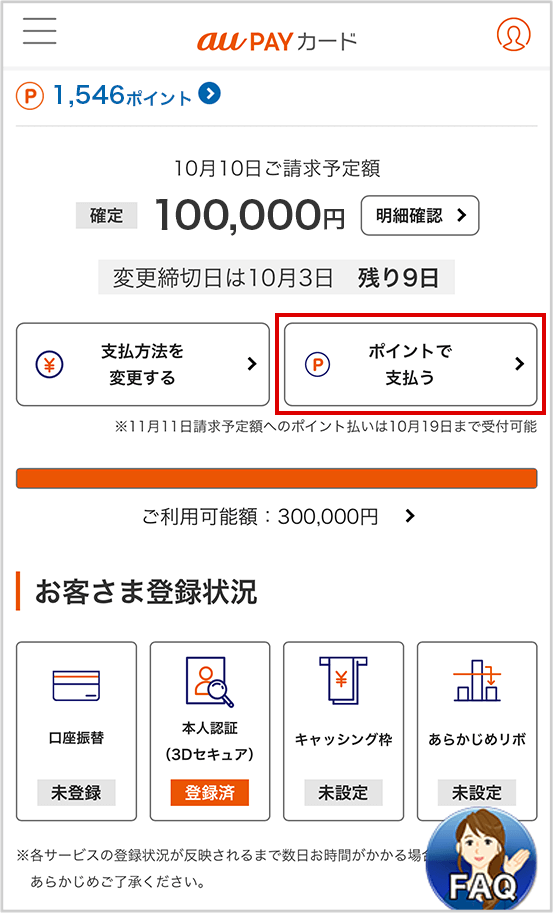 - 毎月ご請求確定日前日~ご請求確定日翌日までは、ポイント充当がご利用いただけません。