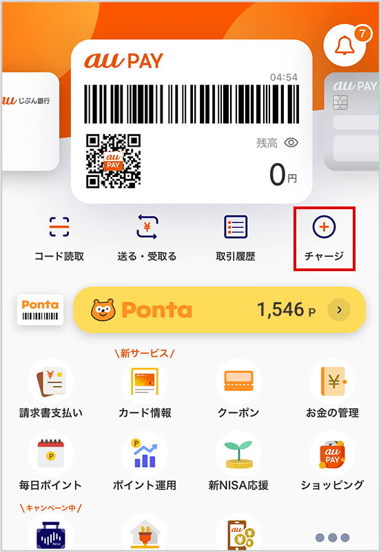 au PAY アプリから簡単にチャージできます。手数料は無料!