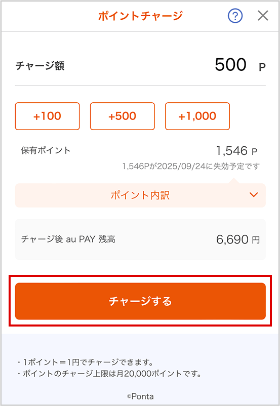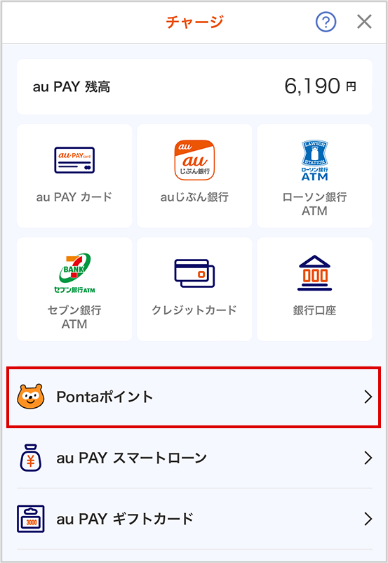たまったPontaポイントは「au PAY 残高」にチャージすれば、スマホ決済サービス「au PAY」でつかえます。1ポイント=1円相当として、上限2万円までチャージできます。