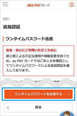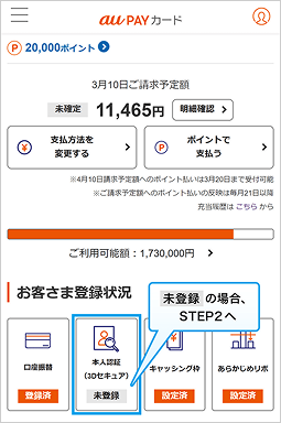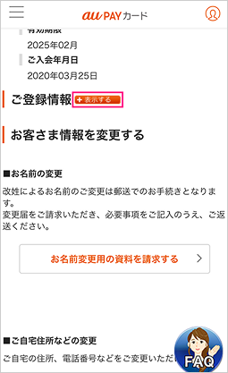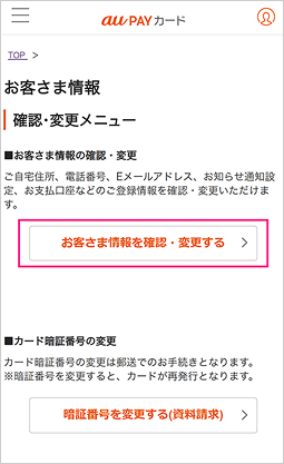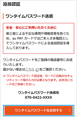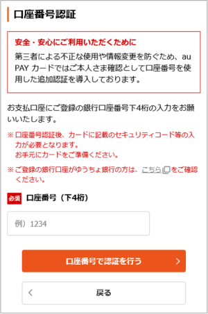 第三者による不正な使用や情報変更を防ぐため、au PAY カードではご本人さま確認として電話番号または口座番号による追加認証を導入しております。
