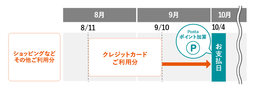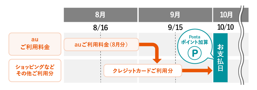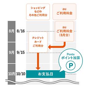 auご利用料金をau PAY カード払いに設定された場合、auご利用料金はご利用月の翌々月10日(※)にクレジットカードのお支払口座より自動引落しとなります。