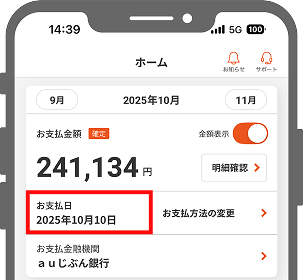 au PAY カードアプリau PAY カードアプリを開き、ホーム画面の「お支払日」からご確認いただけます。