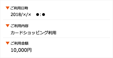 - 一部加盟店では、カードの有効性確認のため、数百円程度の小額の利用承認照会情報を送ってくる場合があるため、「ご利用のお知らせ(利用速報)」メールが配信される場合がございます。実際にお支払いいただくご請求金額は「ご請求金額確定のお知らせ」にてご確認ください。